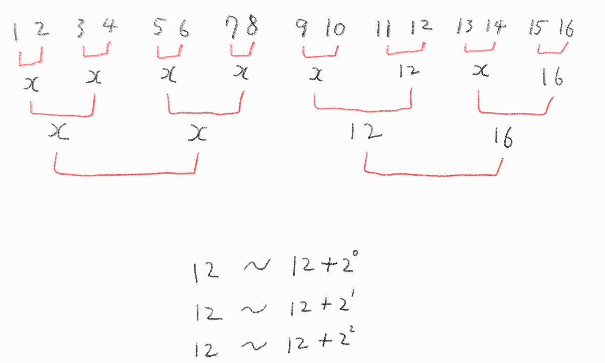 ex) 12, 16이 대결할때 3번째에서 만난다.